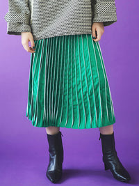 重量感のある素材と、きれいなグリーンに配色になったホワイトのラインが際立つプリーツスカート。ウエストのカラフルなロゴデザインもアクセント。シーズンレスでどんなコーデにも使いやすいおすすめの一点。