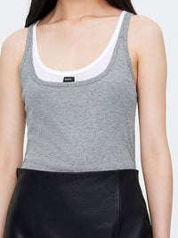 パターンとカラー違いの薄いテレコ素材のタンクトップを重ね着風に仕上げたインナートップス。別々でも使える便利な一点。