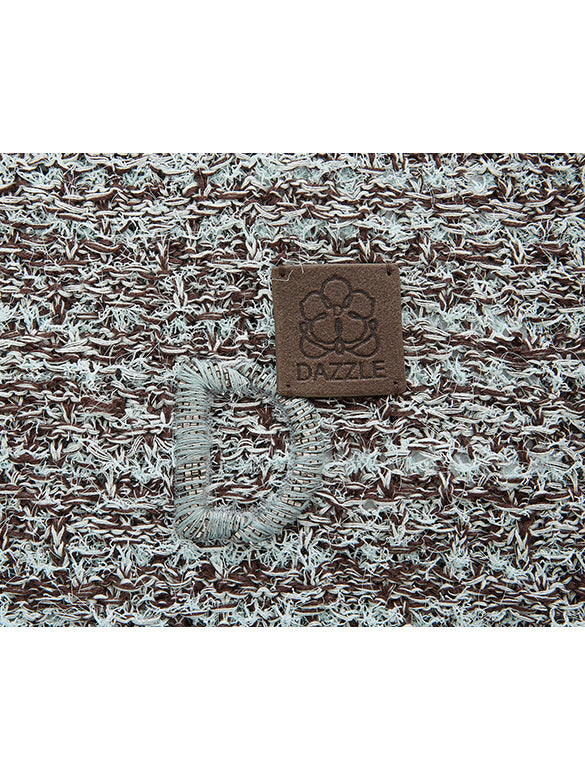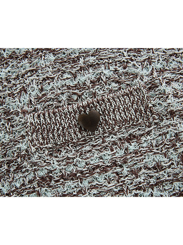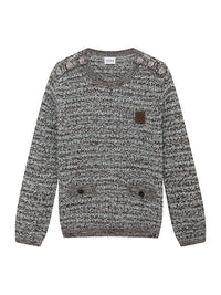 配色の糸が混ざった特徴的な編地のニットトップス。胸元のレザーパッチや、ショルダーにあしらったボタンがアクセントに。