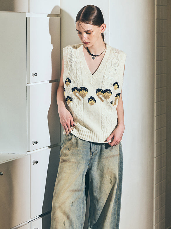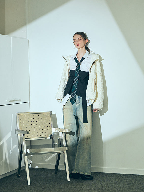 ハードブリーチのデニムに汚れたようなデザインをほどこしたデニムパンツ。ルーズなシルエットでマニッシュなカジュアルテイストに。