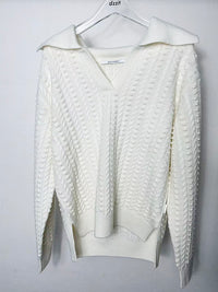 デザイン編みの襟付きニットはシンプルながらも高級感の漂う一点。ほどよい緩さのシルエットも◎。