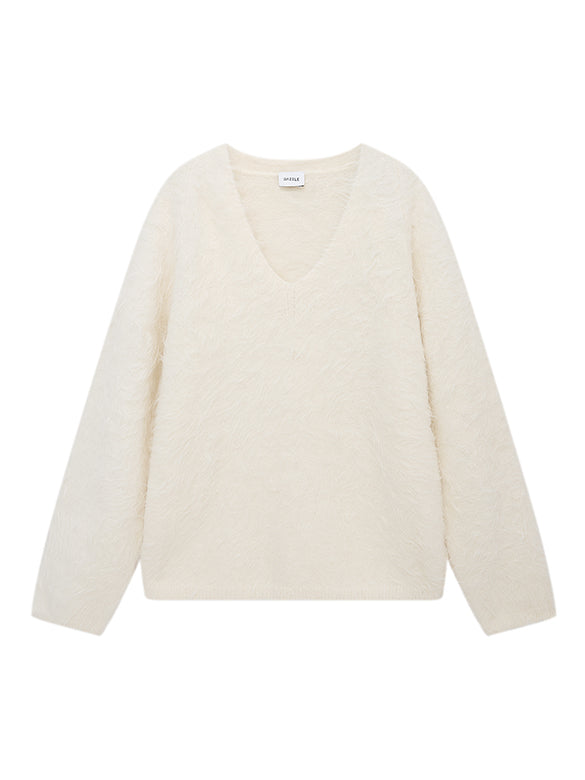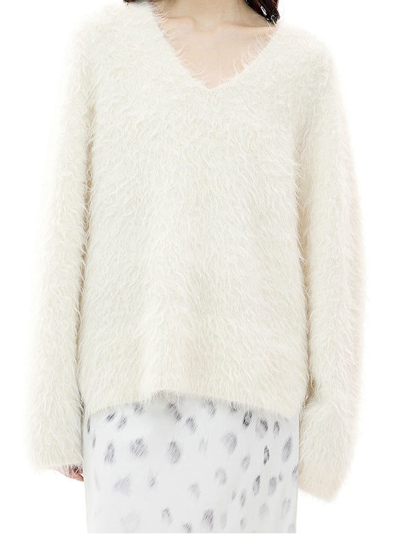 フェザーヤーンのVネックニットはシンプルながらも大人な女性らしい一点。フェミニンなフェザーヤーンの糸と肌見せのVネックの艶っぽさが◎。