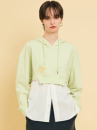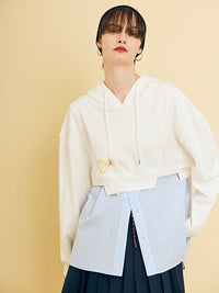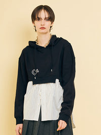 ストライプのシャツとスウェットのショートパーカーをレイヤードしたような、一枚でおしゃれに決まる技ありアイテム。変則パターンで今風のビッグショルダー風のシルエットにデザインしたパーカーと、ストライプの生地のバランスが◎。スウェット生地もミニ裏毛なので、軽くて通気性のあるオールシーズン使える一点。ウエストにあしらったさりげないロゴプリントもアクセントに。こちらは日本だけの限定販売アイテム!!