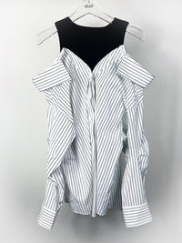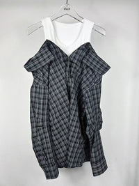リブのタンクトップとオフショルダーのデザインシャツをレイヤードしたような、一枚でおしゃれにきまるデザインアイテム。袖の変則パターンなど、細部までこだわった一点。肩の抜け感で女性らしいデザインに。日本限定販売アイテム!!