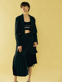 ピンストライプの生地を使った技ありデザインのジャケットワンピース。ショート丈のジャケットとタイトミニスカートを一つにドッキング。レイヤードスタイルにおすすめのデザインアイテム。ベルトを使って一枚でおしゃれにきまるワンピースは、軽い素材なので長く使える一点。スカートレイヤードにもおすすめ!