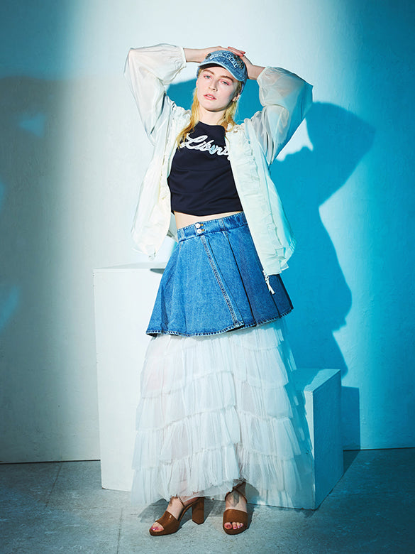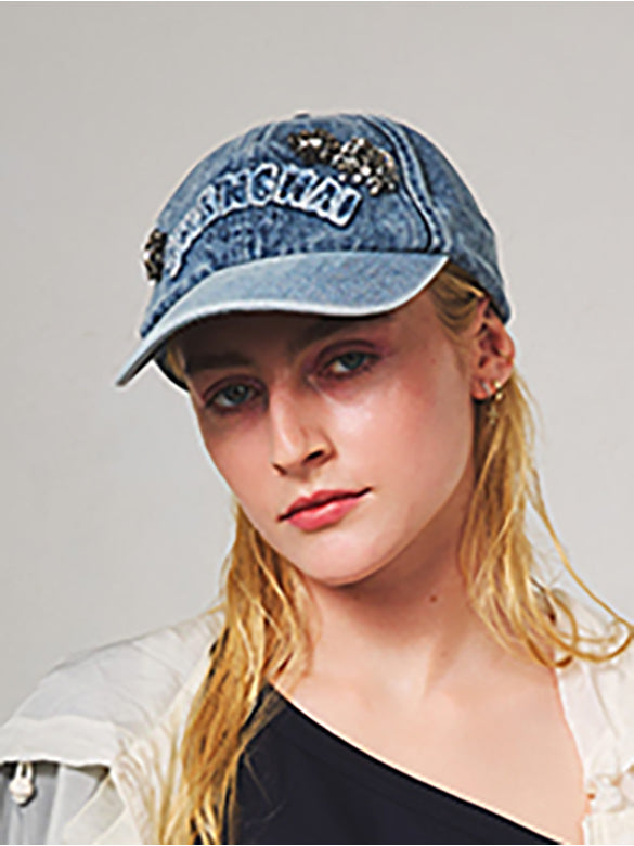 デニム素材のキャップは立体的なデザインと、ビジューのミックステイスト感が◎。