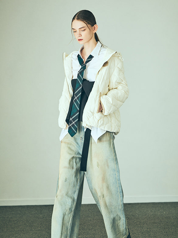 立体的なパターンが特徴のシャツ。抜いて着てもシルエットがモードな仕上がりに。また、ネルシャツなどに使うようなカジュアルなチェック生地のネクタイをセットにすることで、きれい目なモードシャツにグランジ風のテイストをプラス。タイはネクタイ結びでマニッシュにも、蝶々結びでフェミニンにも◎。もちろんネクタイは取り外し可能。レイヤードスタイルにも使いやすいおすすめの一点。日本限定販売アイテム!
