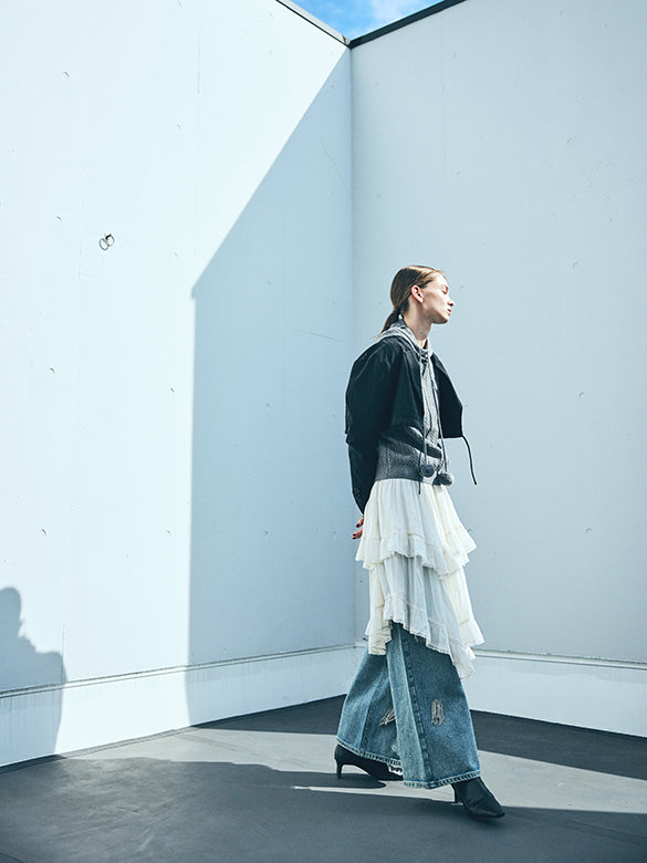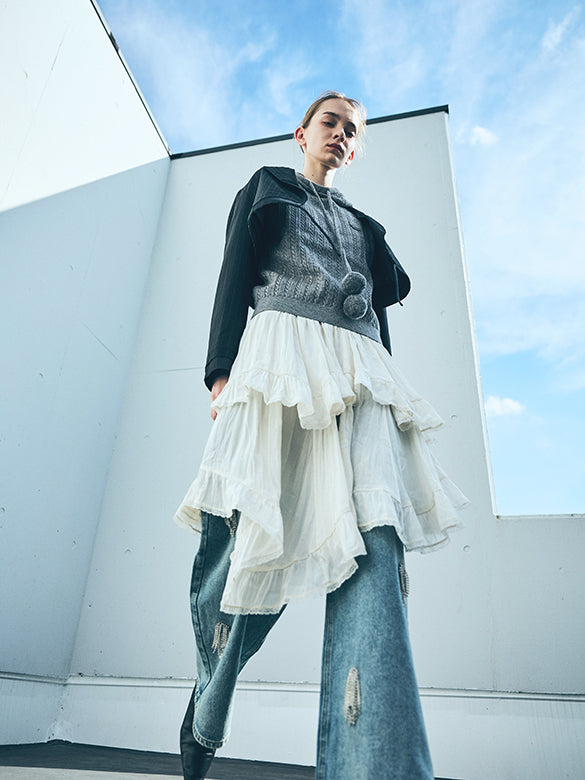 デザイン編みのニットフーディーは、フードの紐の先端にボンボンをつけたポップな一点。ほどよいシルエットであわせやすいのがポイント。