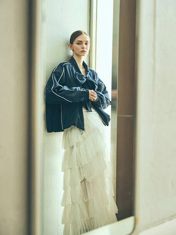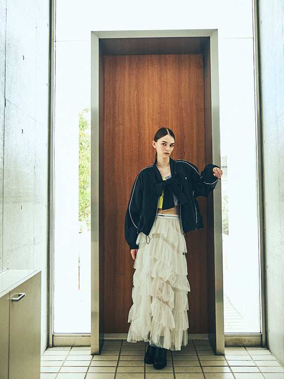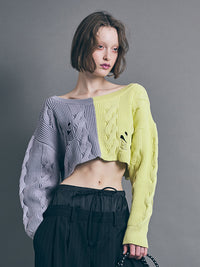しっかりとした綿素材のニットトップスは配色のデザインがインパクト大。さりげないダメージ加工もポイントに。編地はケーブル編みを織り交ぜたデザイン編み。配色バランスや首の開きが気になる方は前後どちらでもOK。流行りのオフショルダーとショート丈で、レイヤードスタイルにも使いやすい一点。カラーはピンク×オフホワイトと、ライムイエロー×グレーの対照的な二色をご用意。