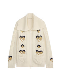 ロゴを使ったデザイン柄のニットアウター。編地もミックス編みでデザインも映える一点。リブ襟のアウターはフェミニンなスカートスタイルにもおすすめ。