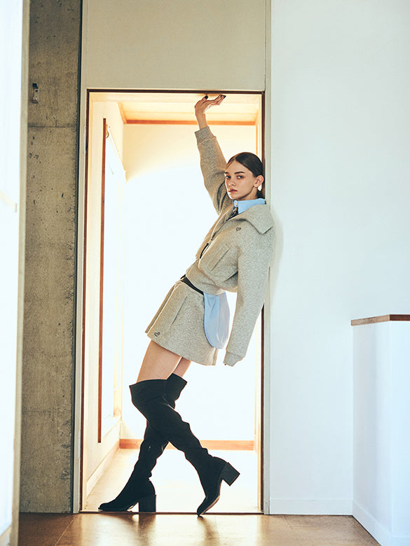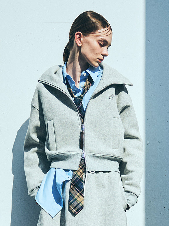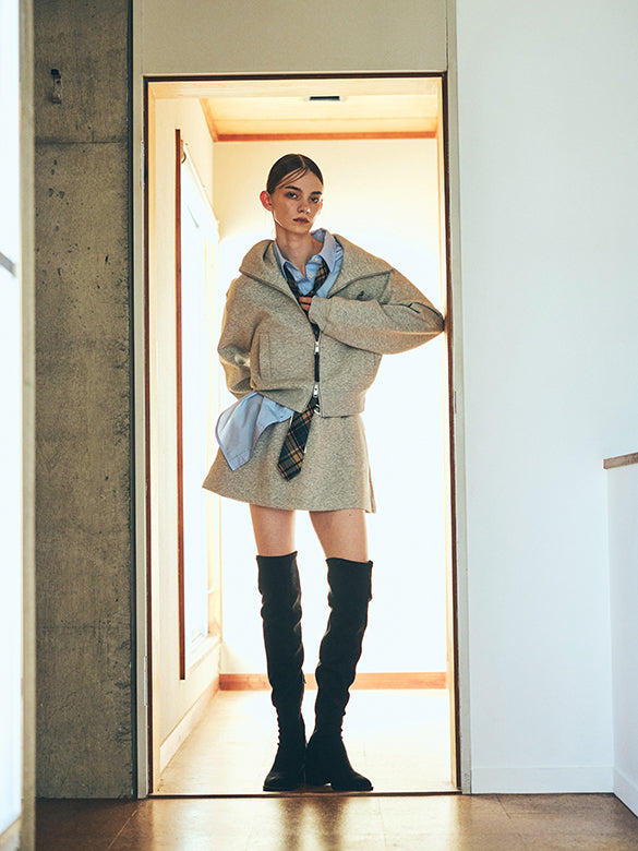 流行りの、ウェットスーツに使われるような張りのある素材をつかったジップアウター。カジュアルながらも特徴的な素材感が◎。あえてフェミニンなアイテムとのコーデがおすすめ。