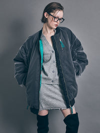 全体に配色チュールを重ねた、MA-1タイプのデザインロングブルゾン。長めの丈でモードな雰囲気に。中綿もたっぷりで防寒性も高く、冬まで使える一点。スライダーにあしらったグログランリボンと裏地の配色バランスがデザインポイント。ミニ丈のボトムでブーツ合わせでも、スラックスなどと合わせてモードな雰囲気にも◎。