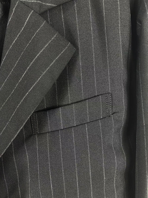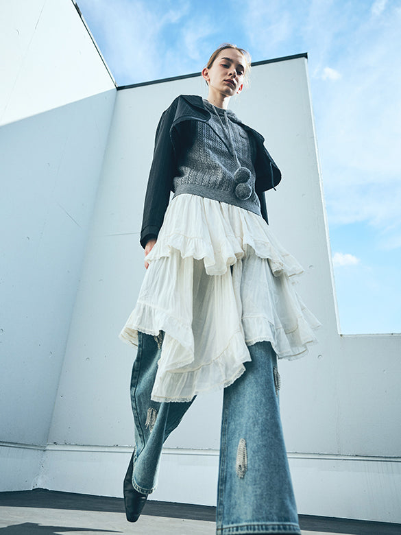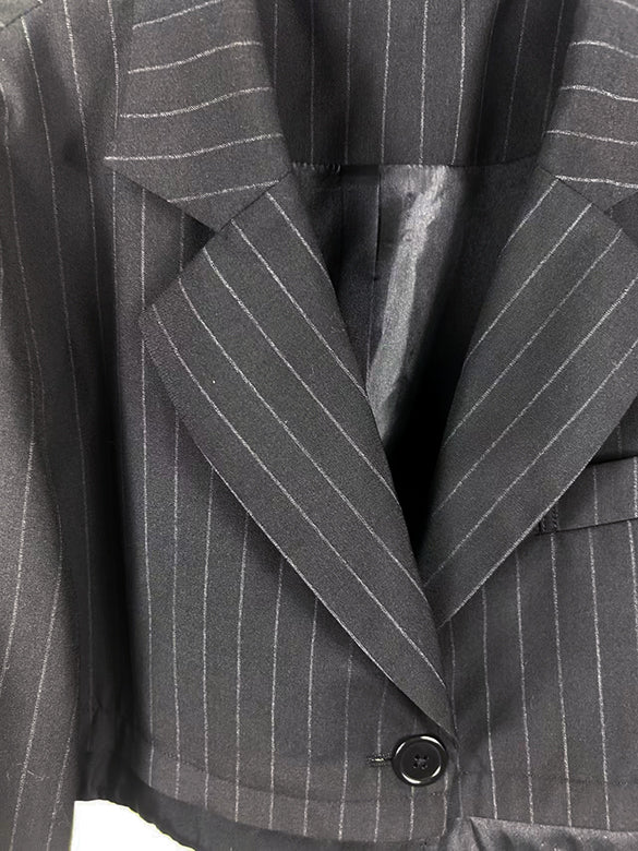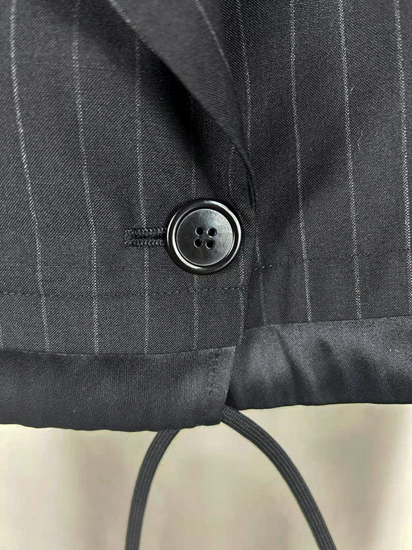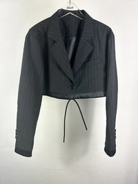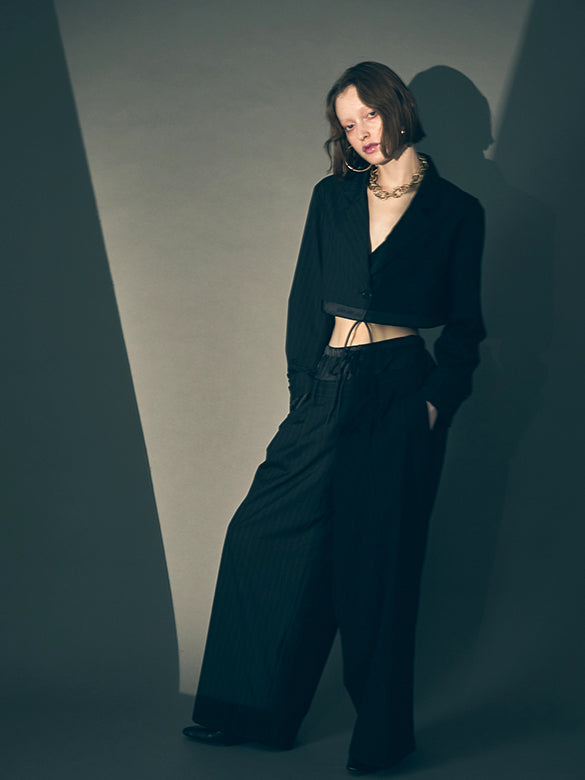 ピンストライプのジャケットは、大胆なショート丈で今っぽく。裾と袖口からサテンの生地をのぞかせることで、レイヤード風のモードなデザインに。裾のドローコードでシルエットも調整可能。パンツとのセットアップでも、フレアスカートやデニム合わせにも◎。
