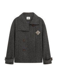 ヘリンボーン柄のウール素材のダブルコート。ジャスト丈なのでスカートにもパンツにも合わせやすいのがポイント。胸元のビジューブローチは取り外し可能。