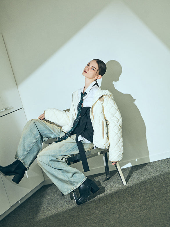 モノグラム柄の生地を使ったフード付きのダウンジャケット。配色コーデュロイのパイピングがアクセント。【品番】3J3K229