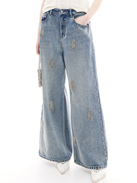 ビジューをフリンジ状にあしらったd'zzitらしいデザインデニム。きれい目のフレアシルエットとビジュー、デニム素材のミックス感が◎。