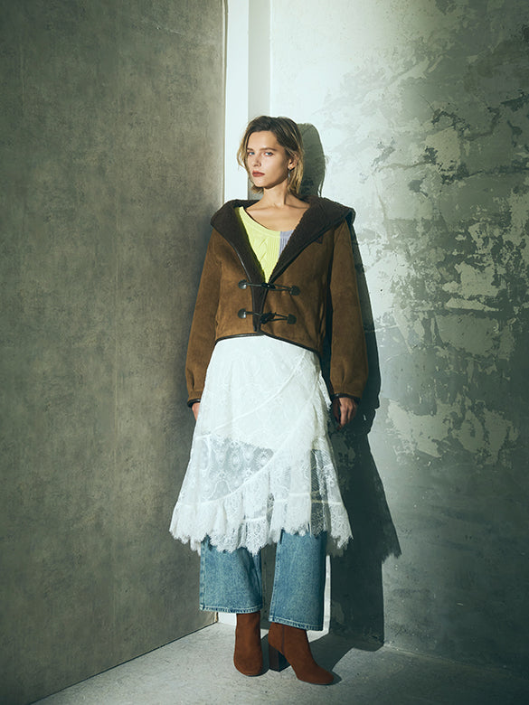 柄のレースを切り替えでアシンメトリーにデザインしたスカート。長めの丈で今風のデザインに。オールシーズン使えるレーススカートは、重くなりがちな冬のコーデにおすすめの一点。