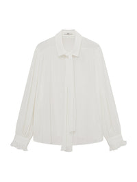 ギャザー使いが特徴的なボウタイブラウス。袖口のフリルなど女性らしいフェミニンな一点。
