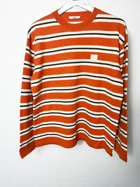 レトロな色合いのボーダーニット。フェミニンなボトムとのコーデがおすすめ。