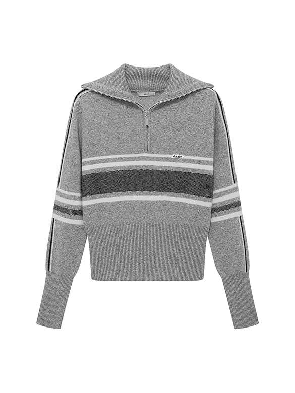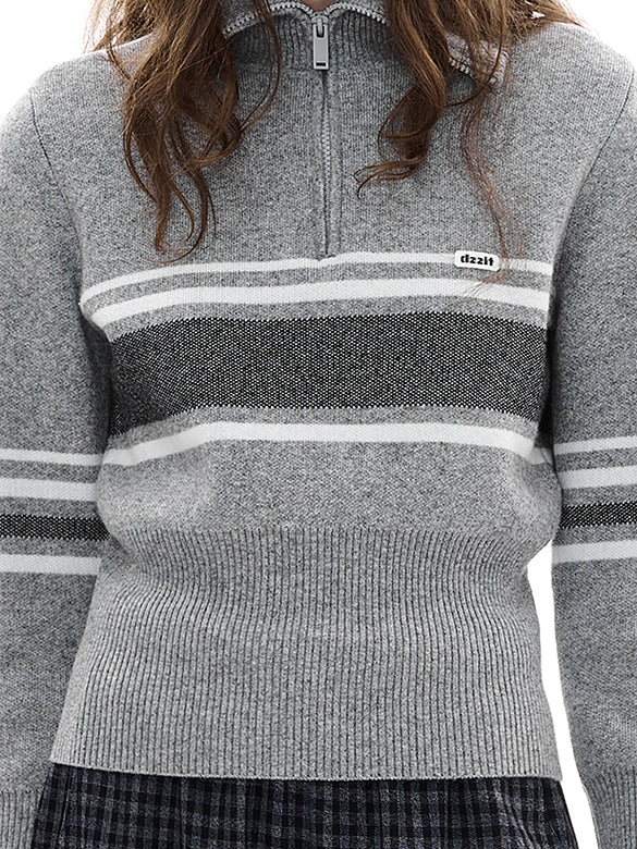 ラインデザインを施したカジュアルなニットトップス。襟元はジップタイプスポーティーな印象に。