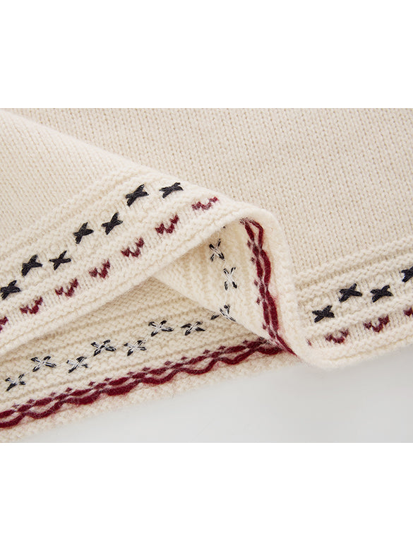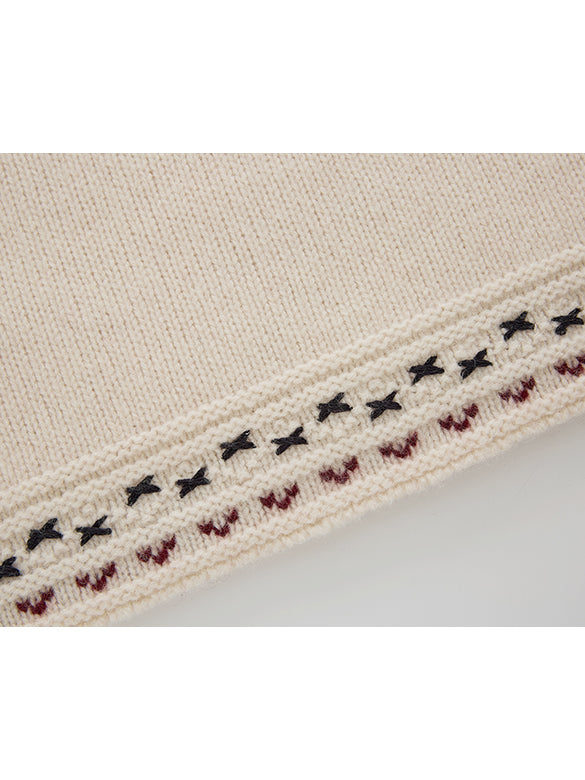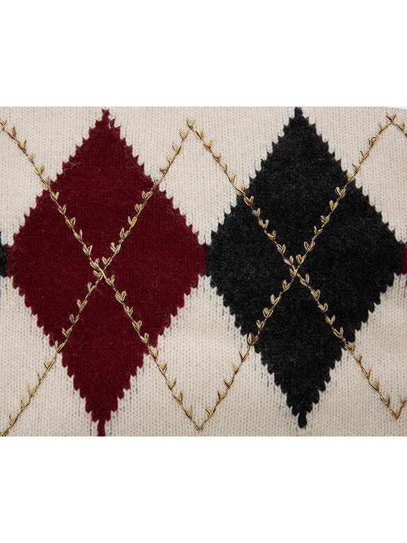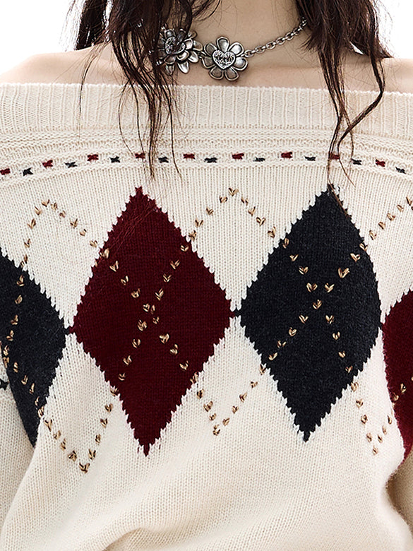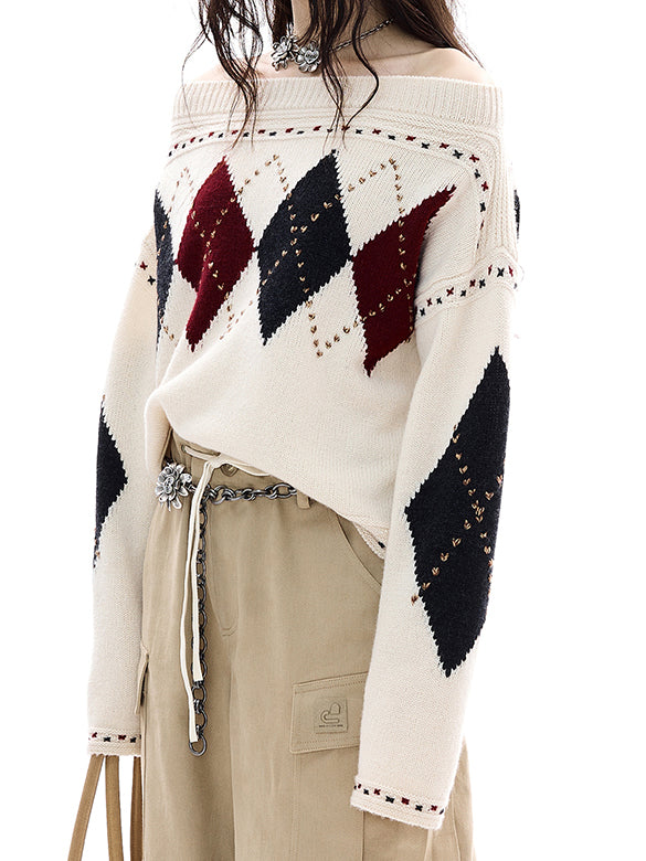 アーガイル柄のオフショルダーニット。ほどよい感じの緩いシルエットが◎。レトロフェミニンな一点。