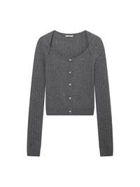 前下がりを大きくとることで首回りをすっきりさせたニットカーディガン。タイトなシルエットと開きで女性らしさを演出。変則的な方のパターンも◎。
