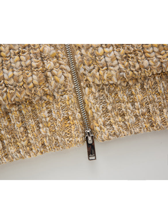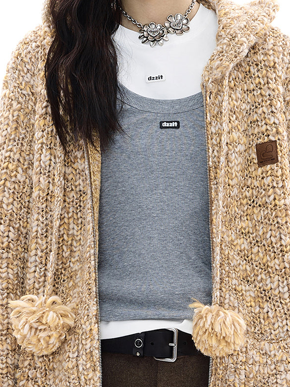 杢ニットを使ったパーカーは、フードの紐にポンポンを使ったフェミニンポップなデザイン。ダブルジップのジップアップタイプなので使いやすさも◎。