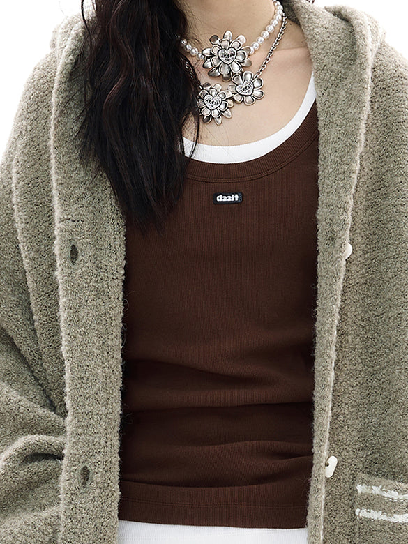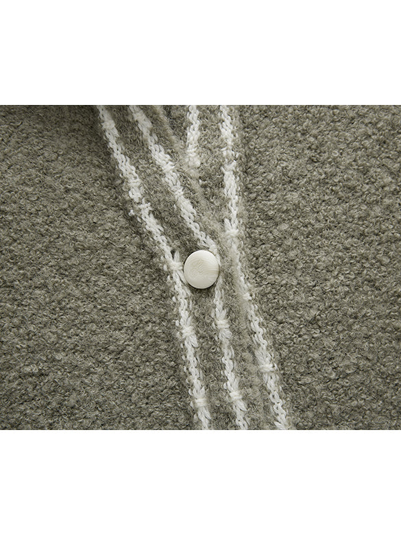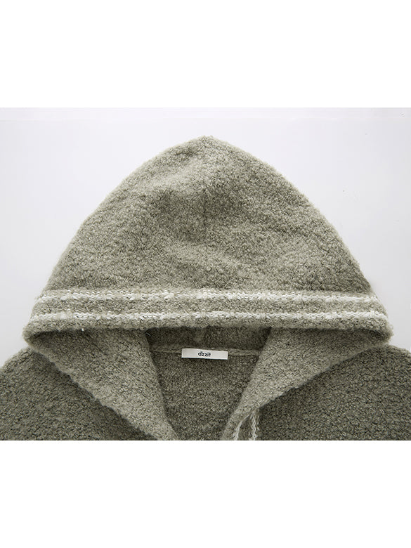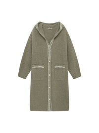 ブークレーのニットガウンはフード付きのロング丈。冬カラーに配色のラインが◎。