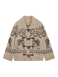 カウチン柄のニットアウターは、レザーを巻きつけたトグルボタンでレトロカジュアルに。