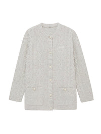 細めのケーブル編みの襟付きニットカーディガン。さりげなく明るいカラーの糸がミックスされているのがポイント。