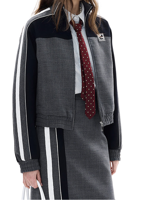 トラッドなブルゾンにスポーティーなラインをあしらったミックステイストのデザインアウター。セットアップにシャツ合わせでフェミニンカジュアルなスタイルに。