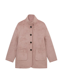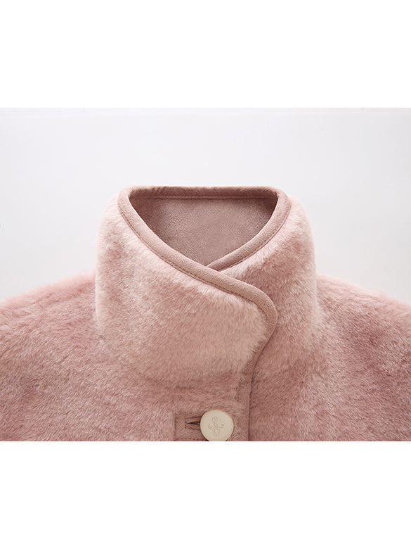 ピンクのフェイクムートンコート。リバーシブルなので、使い勝手も◎。ボタンホールなど細部のディティールにもこだわった一点。
