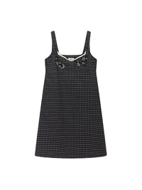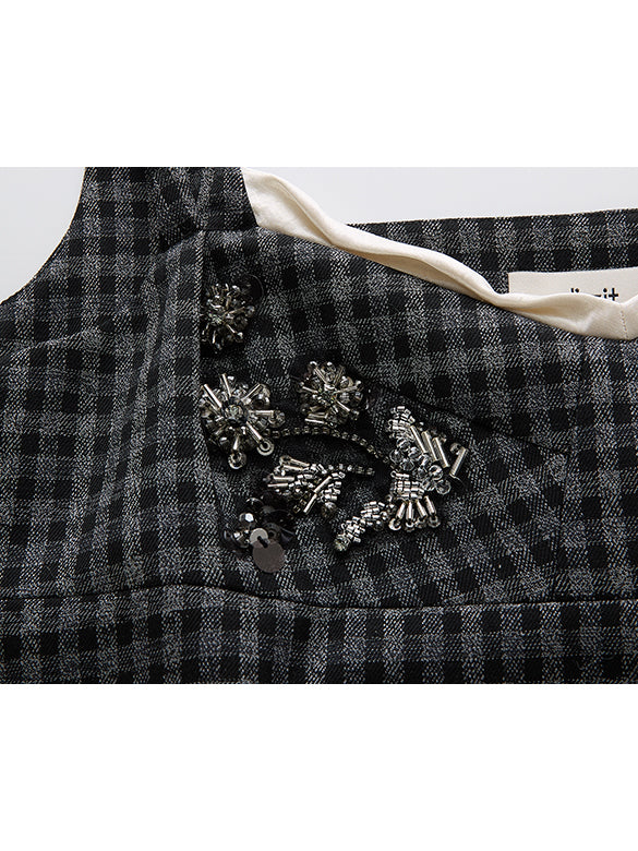 チェックのワンピースはすとんとしたスッキリシルエットでレイヤードもしやすい一点。ビジュー使いがアクセントに。胸元にサテンの異素材をあわせることで、一枚でもレイヤード風スタイルに。
