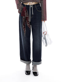 ストレートシルエットのデニムパンツは、スカーフをベルト風にしたデザインアイテム。スカーフ使いは今年流行りのポイント。