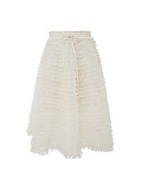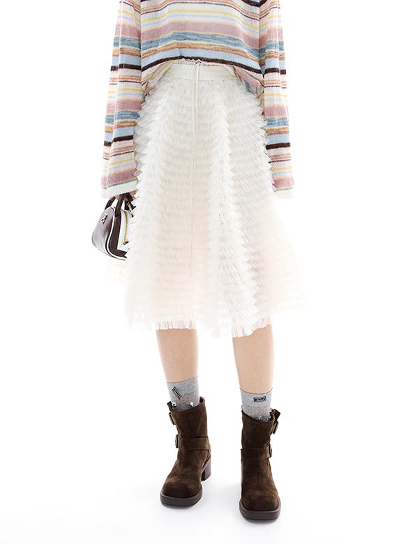細かくティアード状にあしらったチュール素材のスカート。重たくなりがちな冬のコーデに軽さとガーリーな雰囲気を。