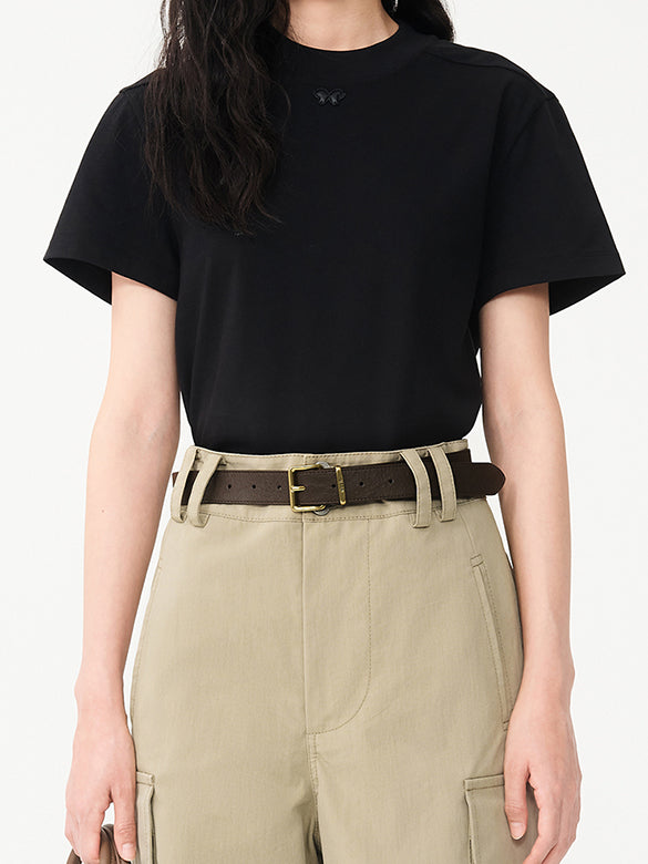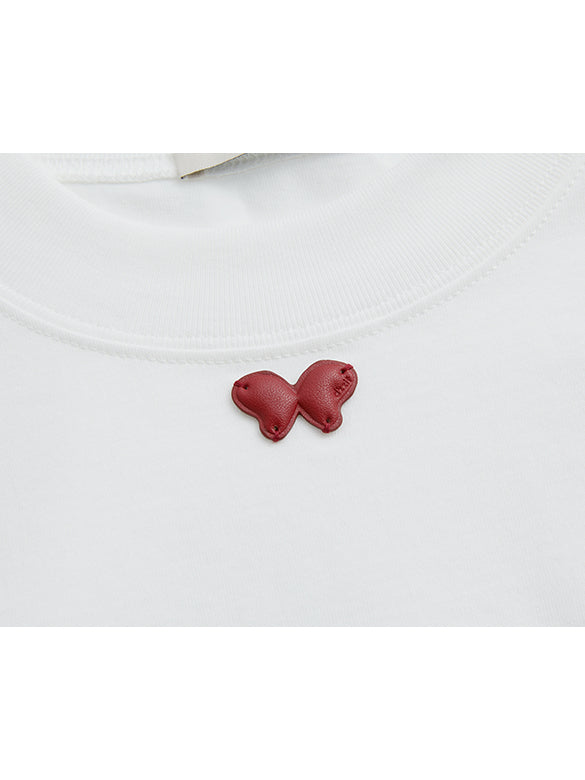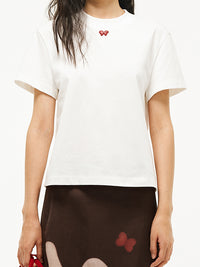 蝶々のレザーの小さなパッチがアクセントになった、コンパクトシルエットのTシャツ。コンパクトシルエットのTシャツは女性らしい人気の一点。