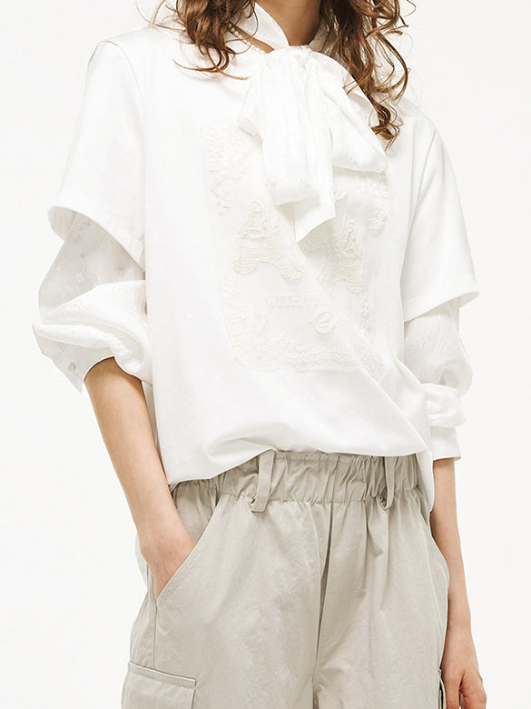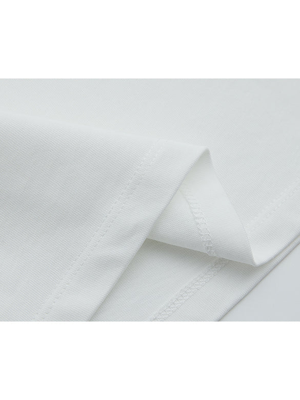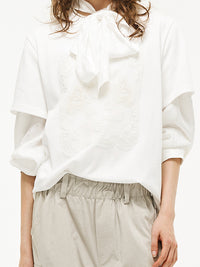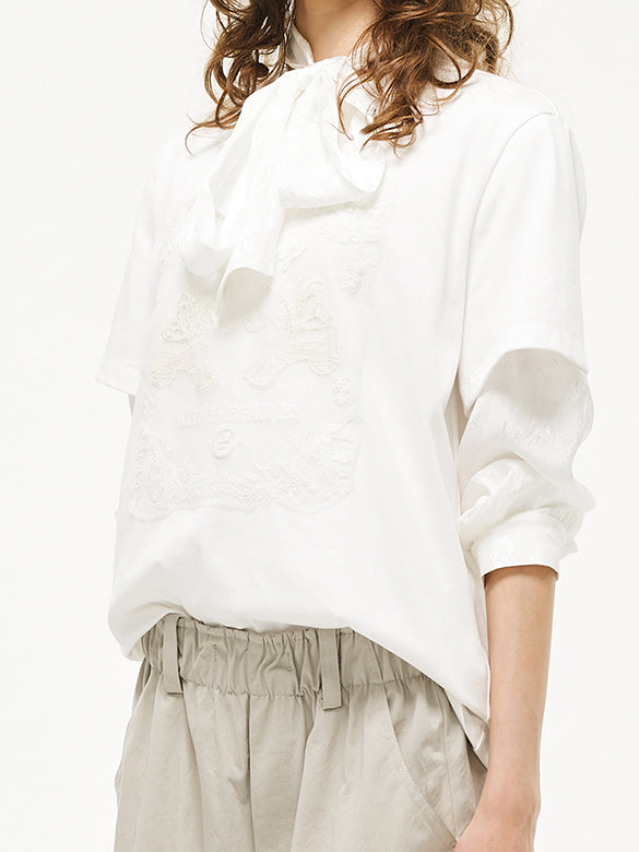 異素材の生地の上にビーズや刺繍をあしらったデザインTシャツ。
