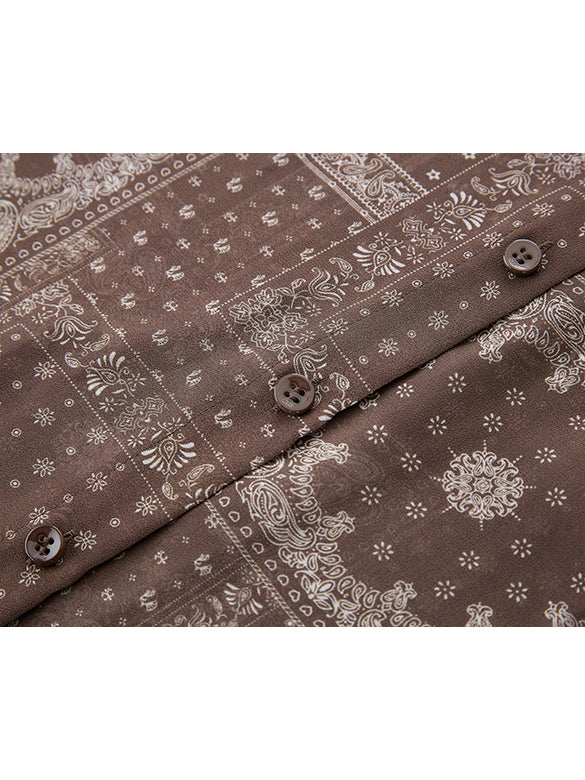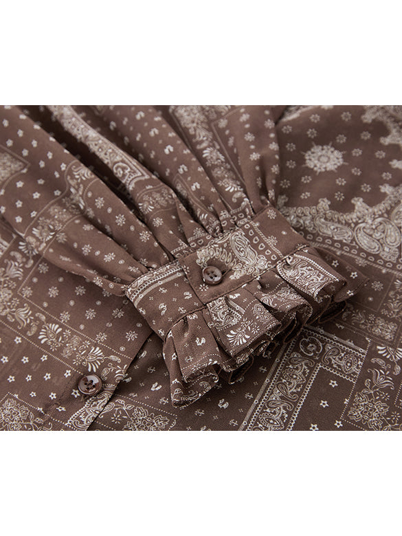 レトロシックな幾何学柄のボウタイブラウス。フリルやギャザー使いで、シックな柄に女性らしいディティールをミックスした一点。