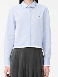 ギンガムチェックのフェミニンなシャツ。襟のシルエットもフェミニンなテイストに。袖口と裾の素材の切り替えもアクセントに。