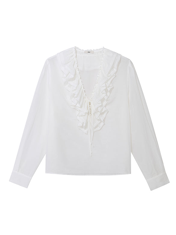 フリル襟のV開きブラウスは、人気の定番アイテム。ニットベストとのコーデにも◎。