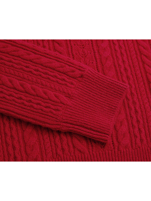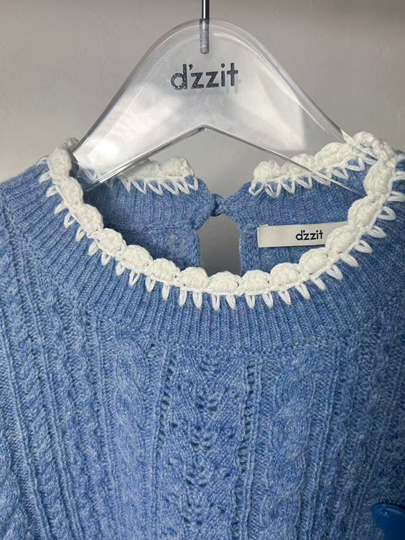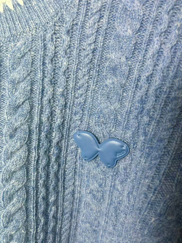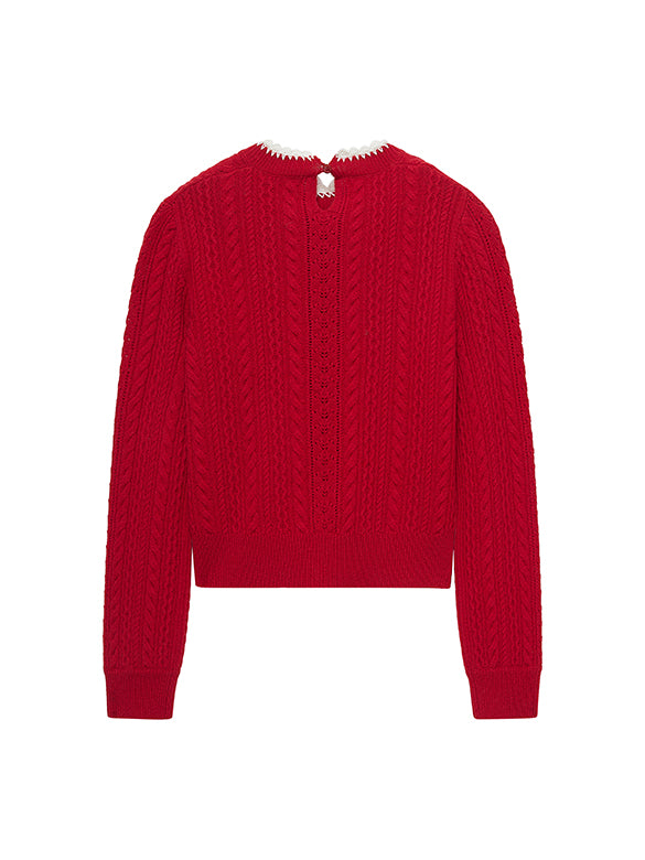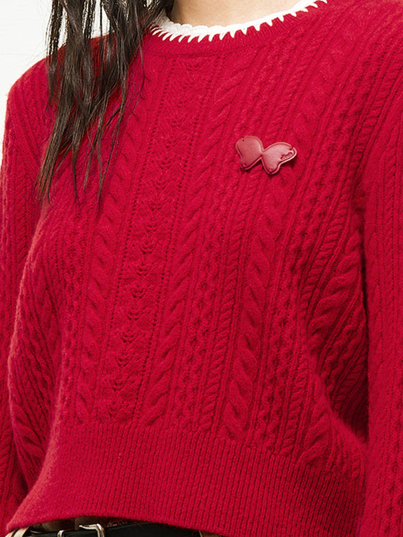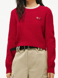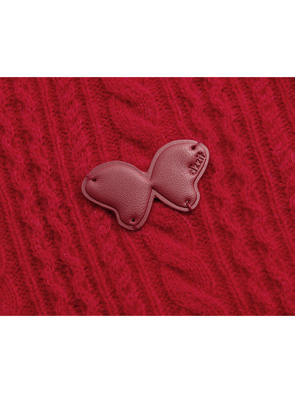 ケーブル混の編地がかわいらしいニットトップス。首回りなどもフェミニンなディティールに。蝶々のレザーのパッチがアクセント。
