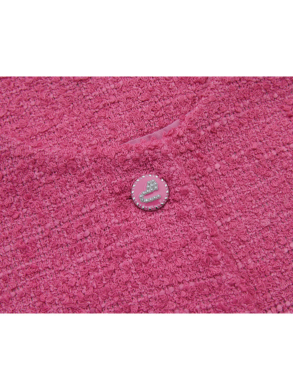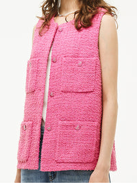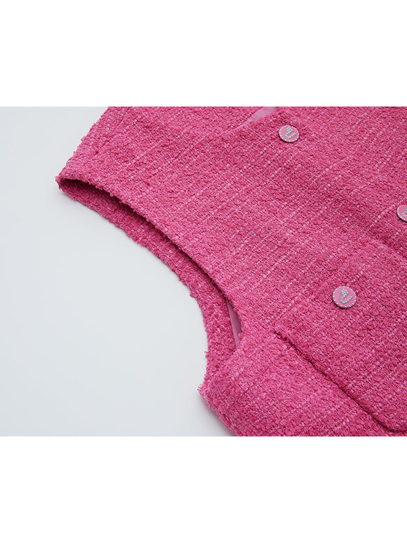 フューシャピンクのツイード生地をつかったベスト。デザインボタンもアクセントに。