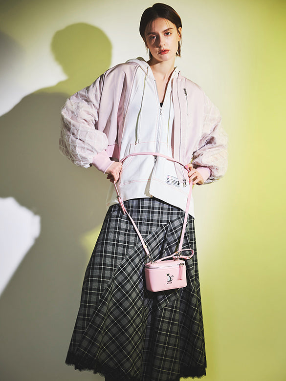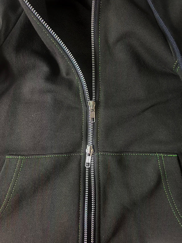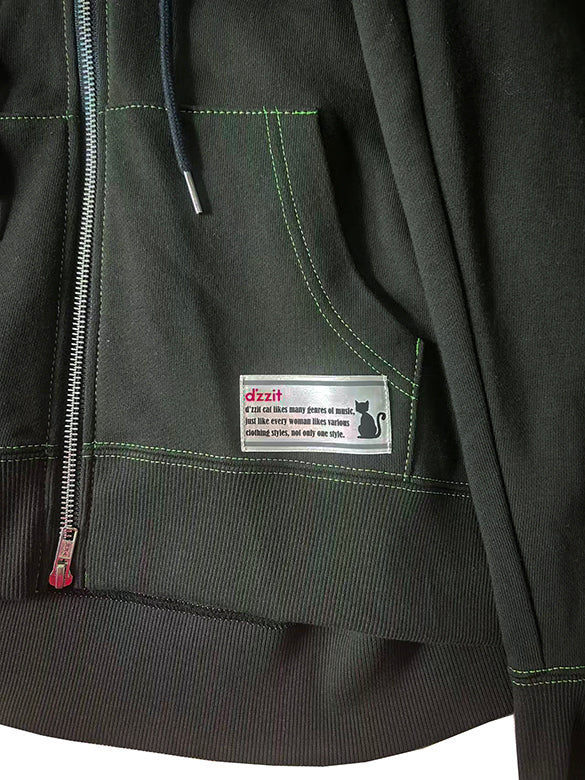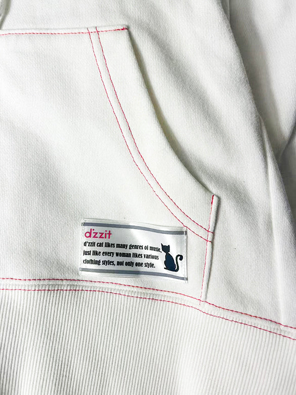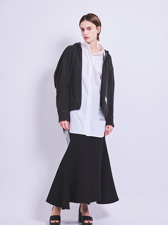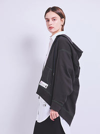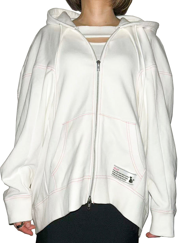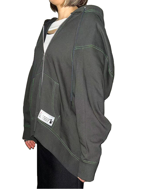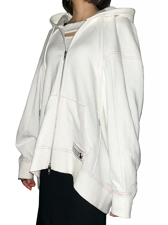 立体的な変形パターンのジップパーカー。配色のステッチがアクセント。立体的なパターンで、フロントが短く、バックサイドにボリュームを持たせたモードなシルエット。Wジップで着回しも◎。大きめのフードで全体のシルエットバランスにもこだわった一点。