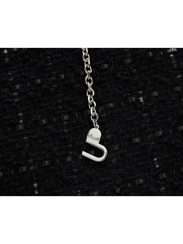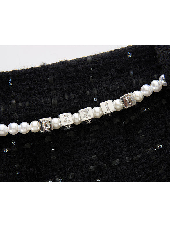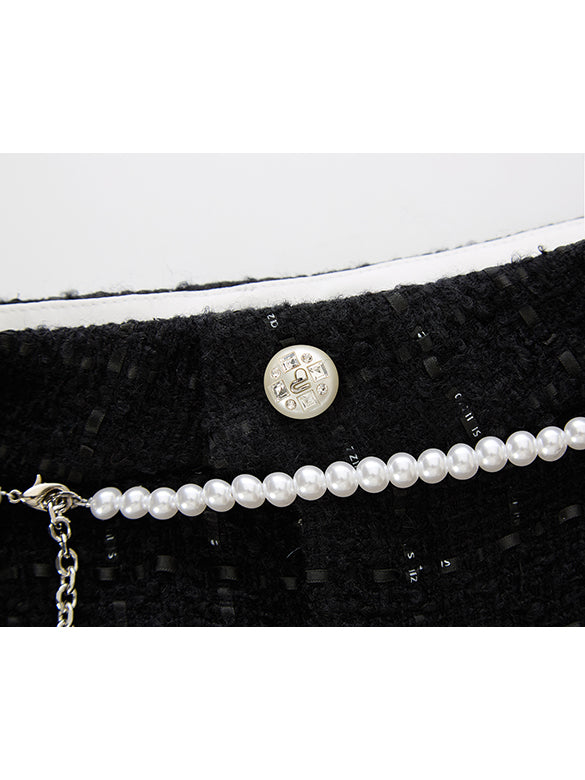 パールベルトがついたツイードのハーフパンツ。クラシカルなツイード素材をつかってカジュアルなハーフパンツをデザインしたミックスアイテム。