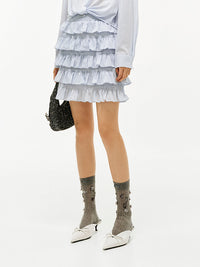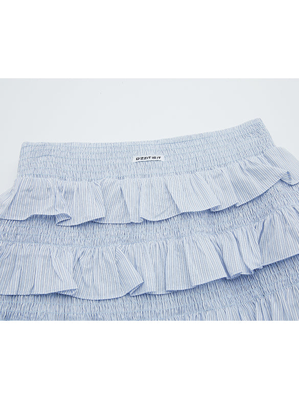 ピンストライプの軽い生地を使ったティアードミニスカート。緩めのシルエットのトップスとの相性がよい一点。