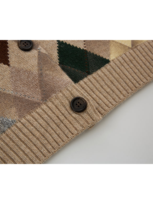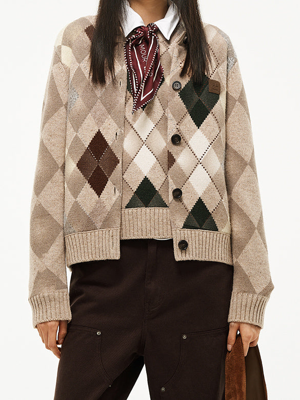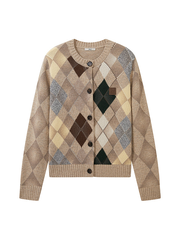 レトロカラーのアーガイル柄のニットカーディガン。レトロなカラーながらもポップさもある一点。