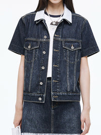 半袖のデニムジャケットにストライプの襟をつけることで夏らしさを演出した一点。襟は取り外し可能。